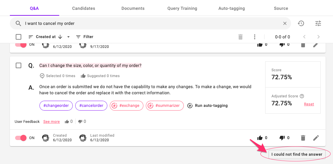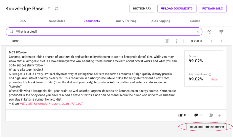 In Documents as well, if you can't find an answer, you can add the query to Candidates by clicking the "I could not find the answer":