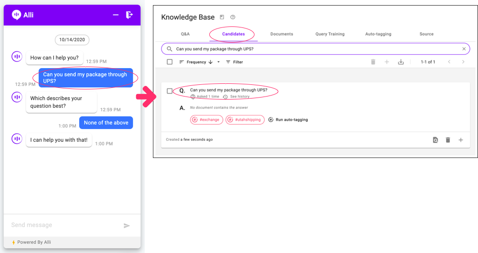 The same goes for queries from your end-users if you are using our AnswerBot SDK. When the end-user's question returns no answers, it will be automatically added to Candidates:
