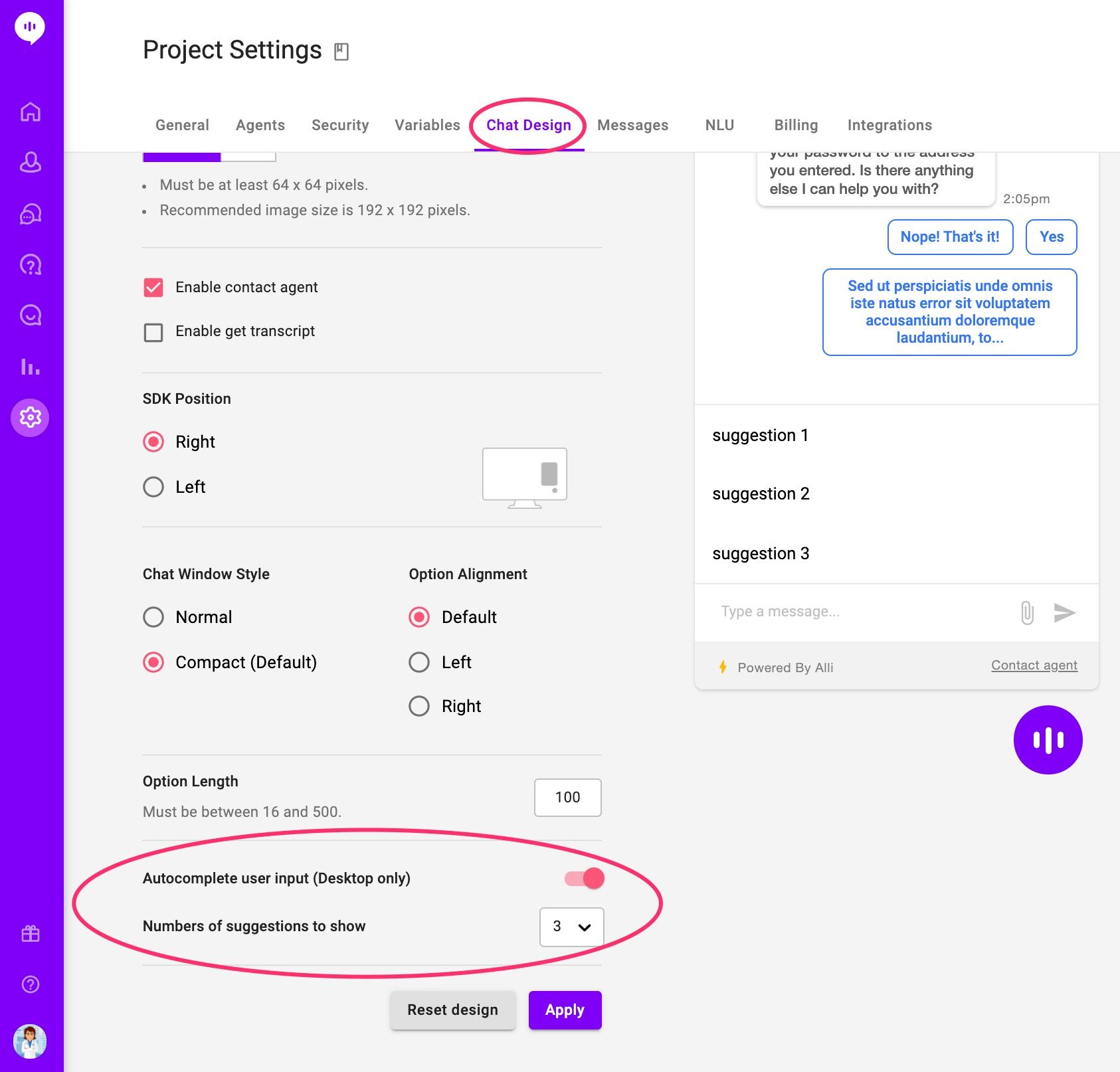 The second configuration you need to set up is the Autocomplete feature. It is important for multiple reasons – not only it is a convenience people now expect, it can help your customers construct more useful questions than they might on their own and make suggestions based on what Alli's AI has learned from your large corpora of FAQ and documents uploaded. To set up autocompletion, visit the Chat Design tab in Project Settings and switch on the feature at the bottom of the page. You also have the additional option of settings the number of suggestions to show.
