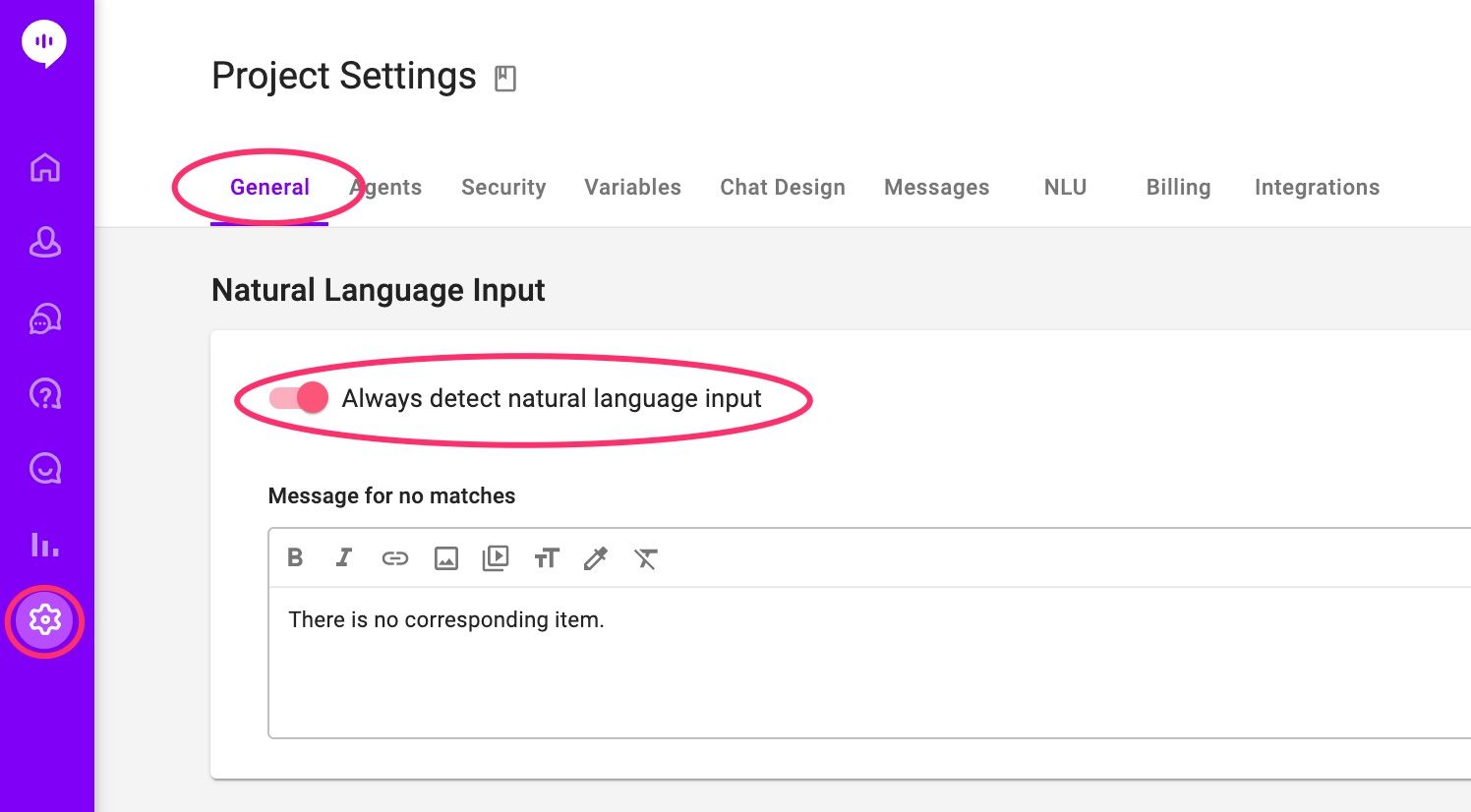First, within Project Settings, turn on 'Always detect natural language input.' Alli can provide a remarkable conversational experience by analyzing unstructured input from your customers and give responses based on intent. This gives the overall feel of a natural conversation and not one with a machine.