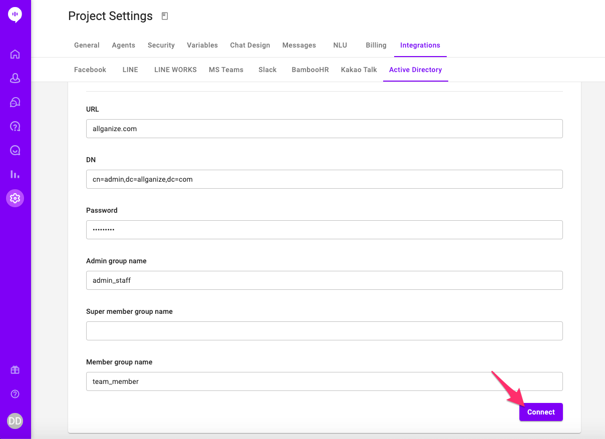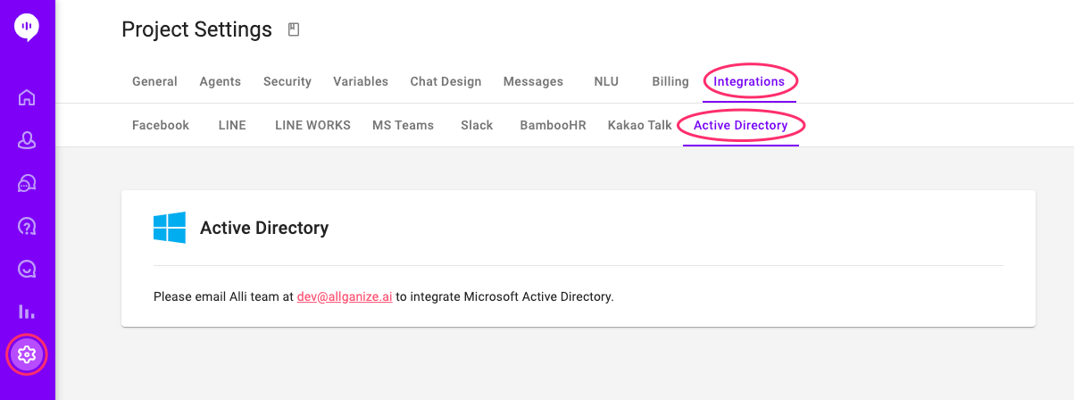 You can find the 'Active Directory' tab under the Settings > Integrations. But first, you need to ask your Allganize agent to unlock the feature for your project. Your agent will help you to confirm the domain ownership for the domain you're using for your Active Directory.