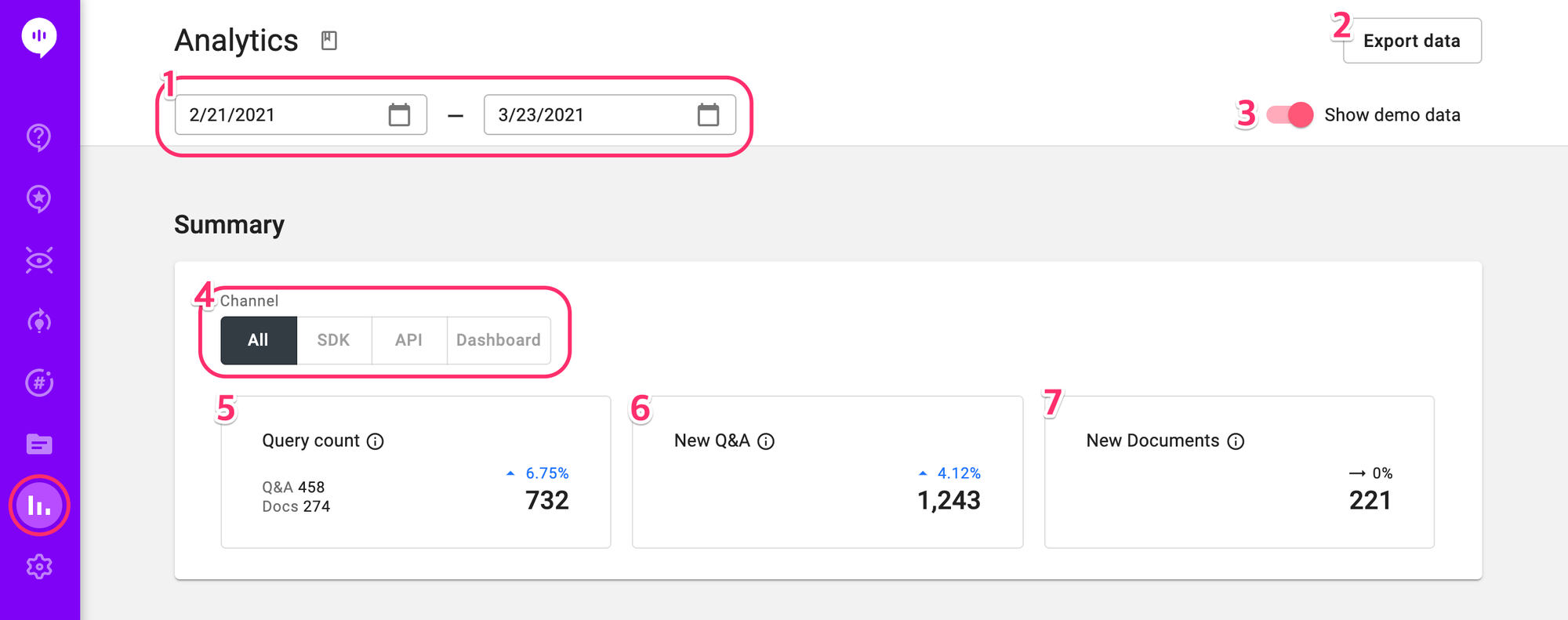 - Source filter: Click each source to see the break-down numbers from each knowledge source (Q&A, Documents)