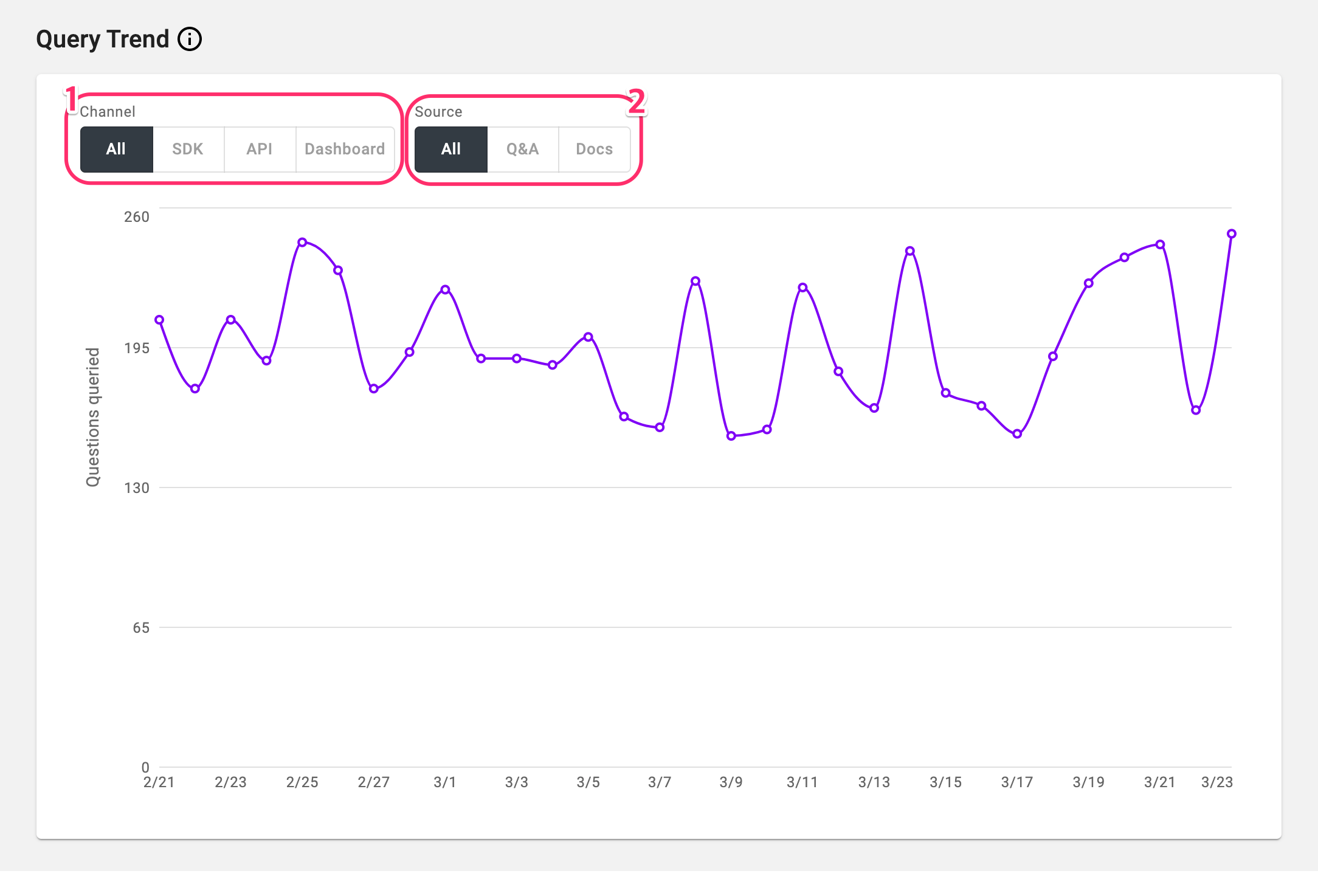 The Query Trend graph shows the daily trend of the number of queries using Q&A or Documents. You can apply Channel and/or Source filter.