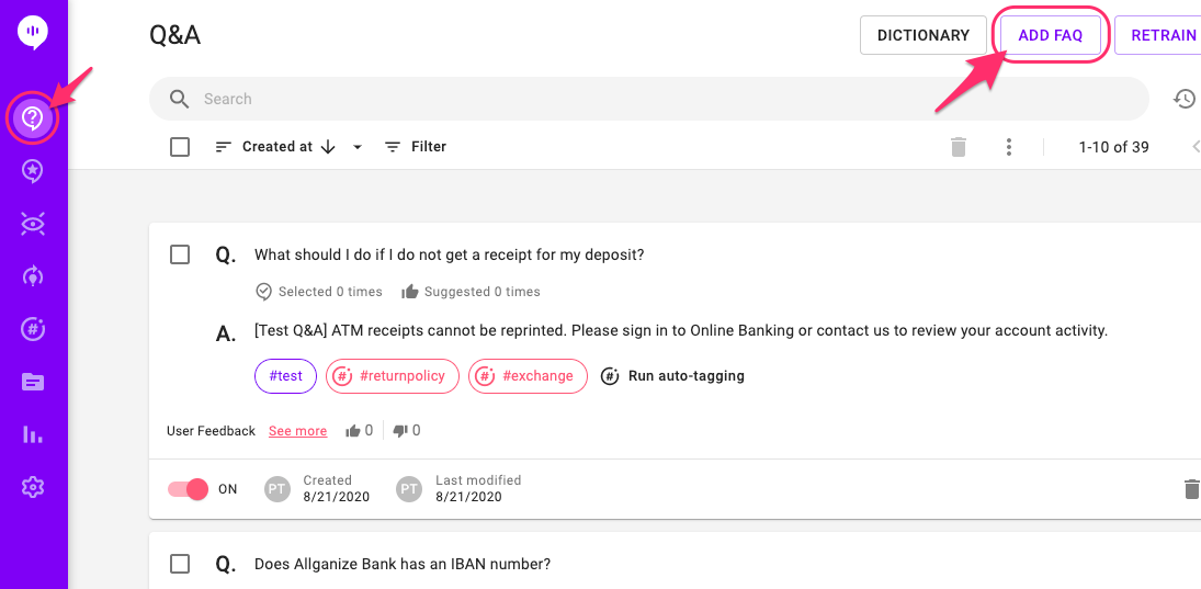 To start, go to the Q&A menu and add some Q&As. Click the 'ADD Q&A' button at the top right corner, then click 'Upload Q&A' to upload multiple Q&As in a file form, or 'Add Q&A' to add them directly on the dashboard.