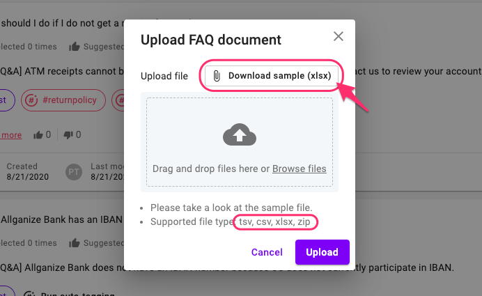 When uploading Q&A file, download the sample file to see the format of the file. Tsv, csv, xlsx, zip files are supported.
