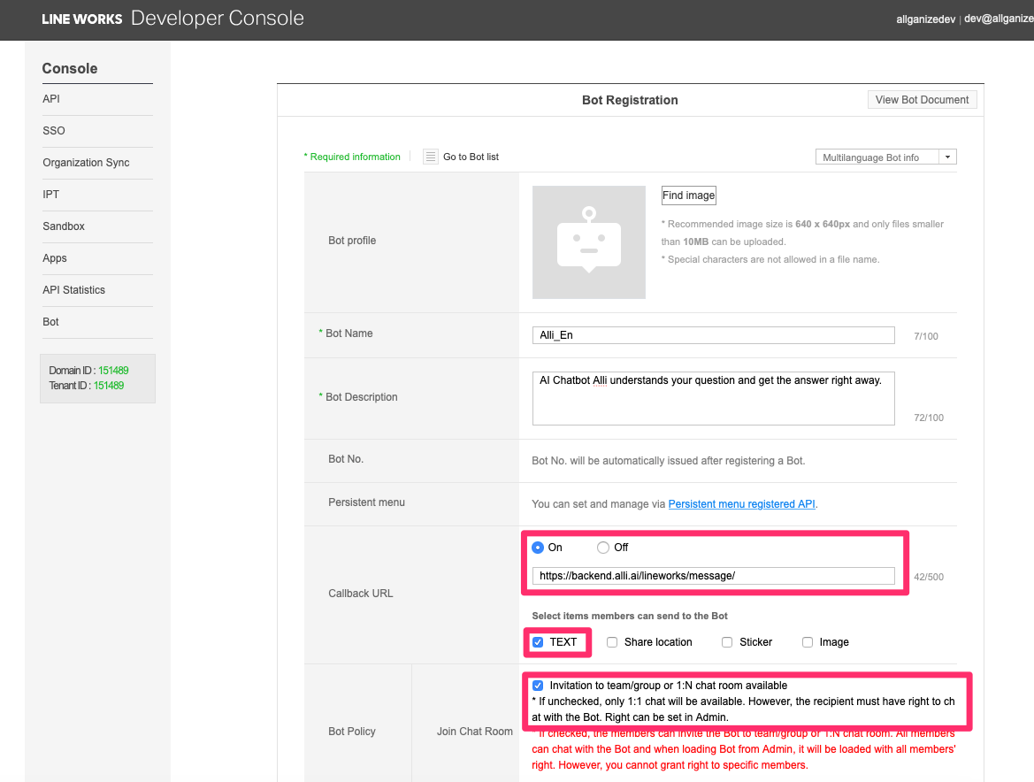 - Select 'On' under 'Callback URL' and put this url in. https://backend.alli.ai/lineworks/message/
