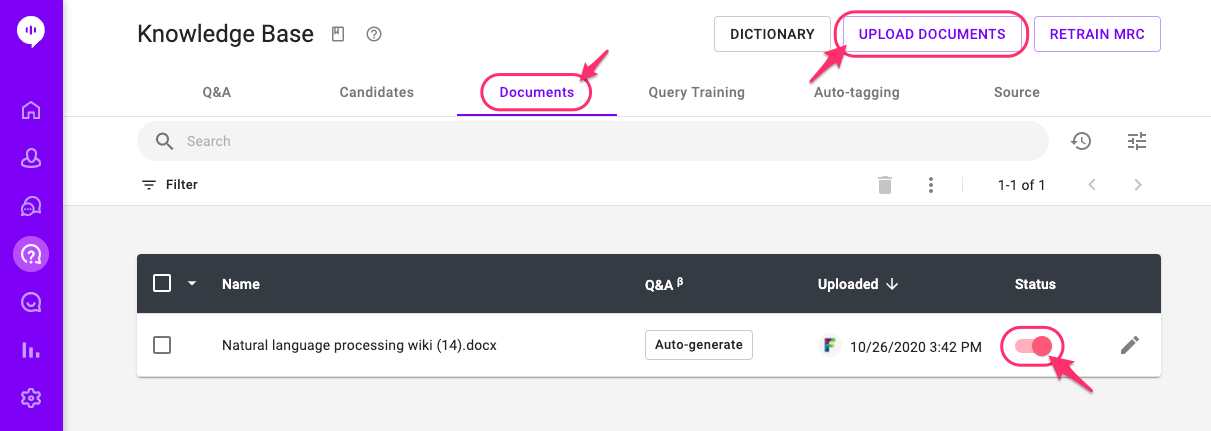 To use this feature, you must have at least one enabled document uploaded under the Documents tab in the Knowledge Base menu. We currently support txt, docx, xlsx, doc, ppt, pptx, jpg, jpeg, png, and pdf format.