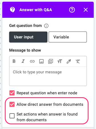 To activate this feature, check 'Allow direct answer from documents' checkbox in the Q&A node. If you want to set a different chat route for answering from documents, check 'Set actions when the answer is found from documents'.