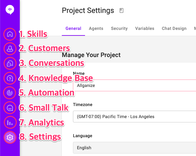 - Knowledge Base: You can upload Q&A database and Documents here to search answers for customer questions