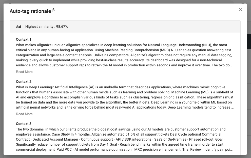 2. Auto-tag rationale: Click to see why these tags are suggested. Alli will show you parts of the document to provide the context for the suggestions.