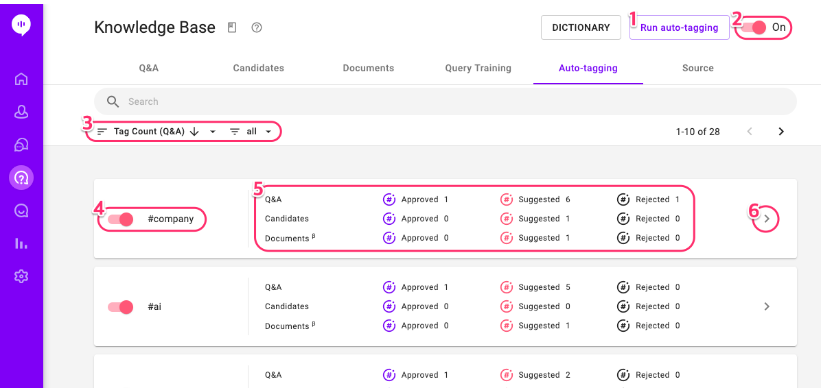 - Current status of the tag. You can see how many tags are Approved / Suggested / Rejected for Q&As, Candidates, and Documents.