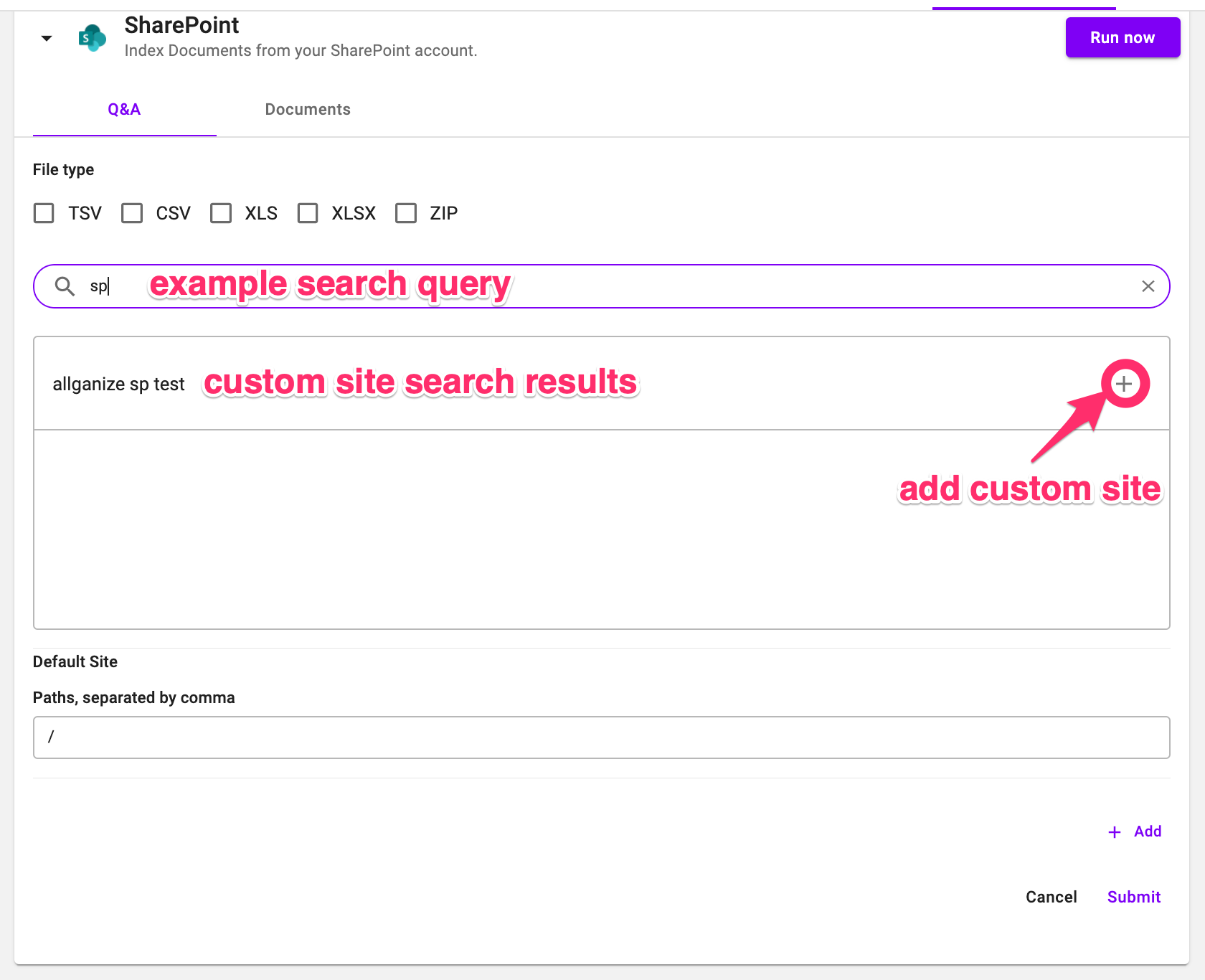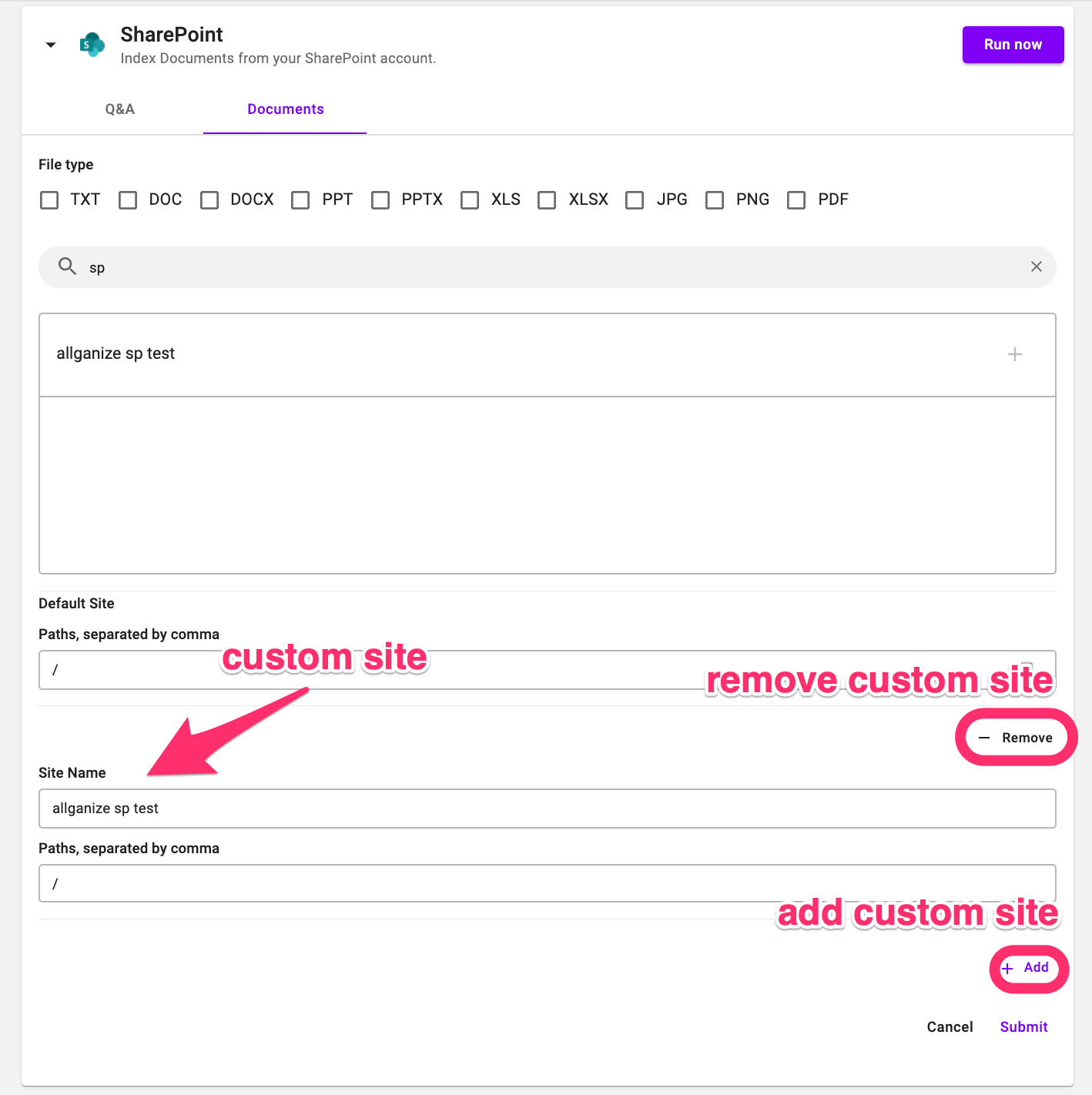 Here, you can set the file types to be indexed and file paths. Indexed files will be uploaded to Q&A or documents. By default, Alli will only index from your Default Site. You can also add extra custom sites for indexing. Simply search for the site and add it. After you add a custom site, don't forget to set the paths for the side as well. Once you're all done, click the submit button at the bottom right to save the changes.