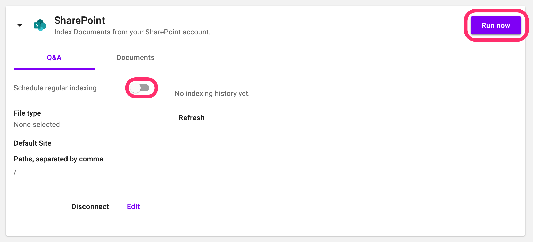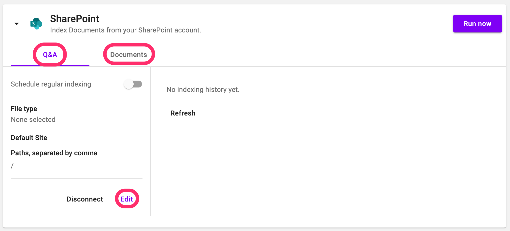 Depending on whether you wish to index Q&A or documents, navigate to the corresponding tab and click "Edit" to configure your indexing settings.