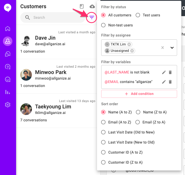 - Filter by variables: Filter by variable value for the customer. For example, you can filter out customers with no email addresses by setting the condition as '@EMAIL is blank'. Click '+Add condition' button to start adding conditions. Multiple conditions work with AND logic (only the customers who meet every conditions are shown).