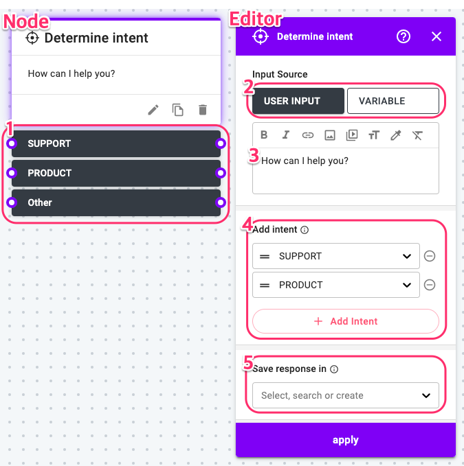 - You can choose the input source to determine the intent. When the USER INPUT is selected, customer's input will be used as the source. When the VARIABLE is selected, the value for the selected variable will be used.