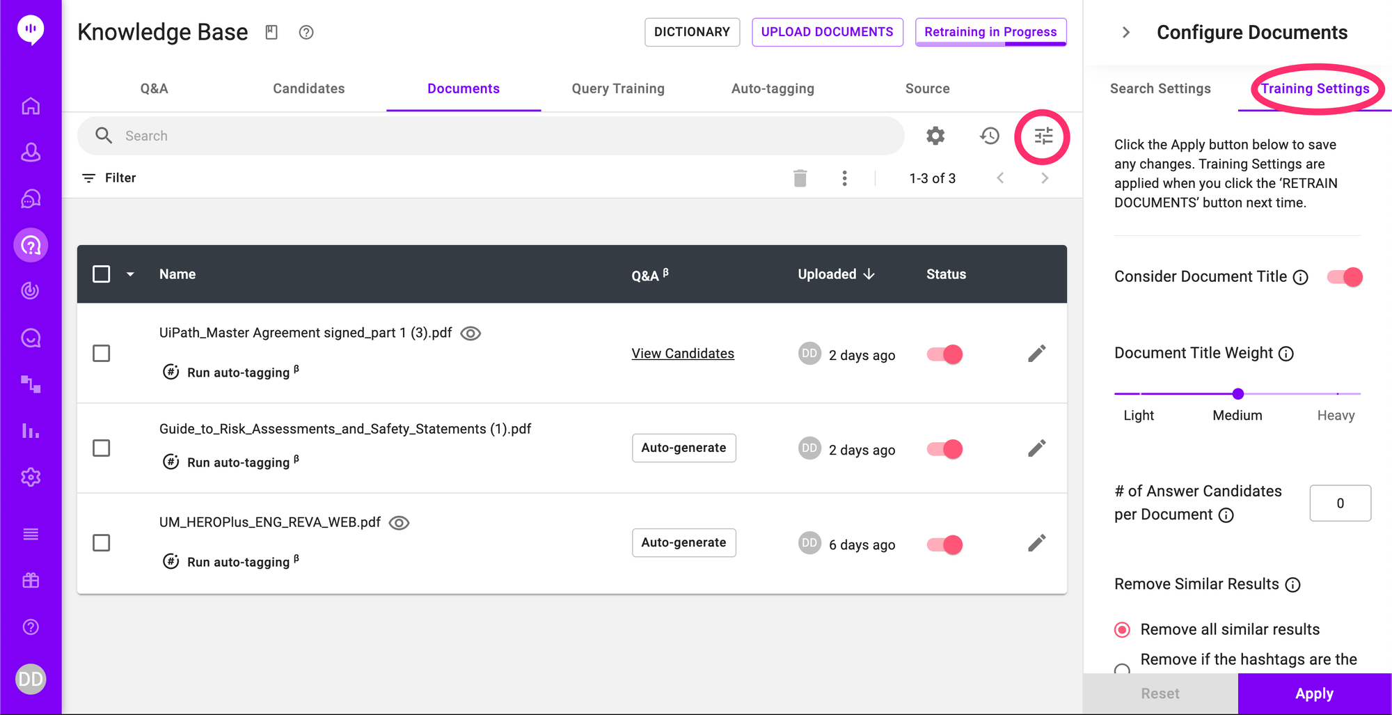 You can configure your document training by changing the new training settings. They can be found by clicking the settings icon on the Documents page and navigating to the "Training Settings" tab.
