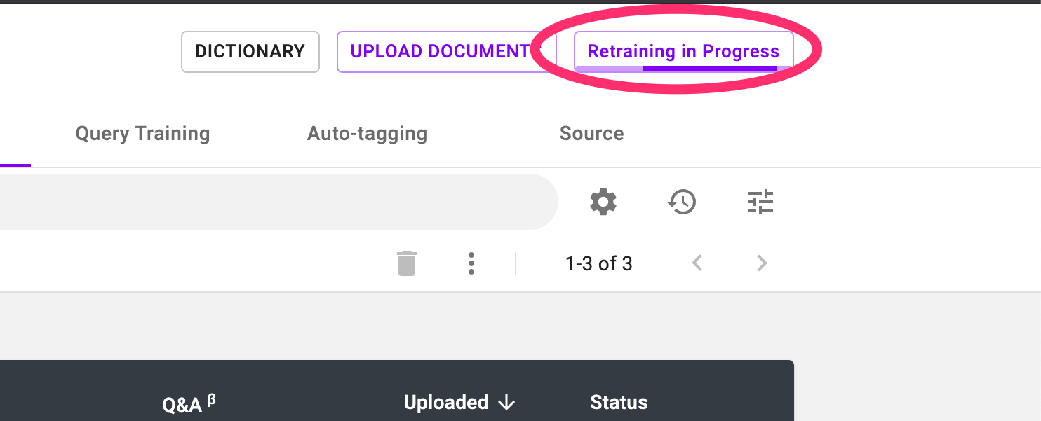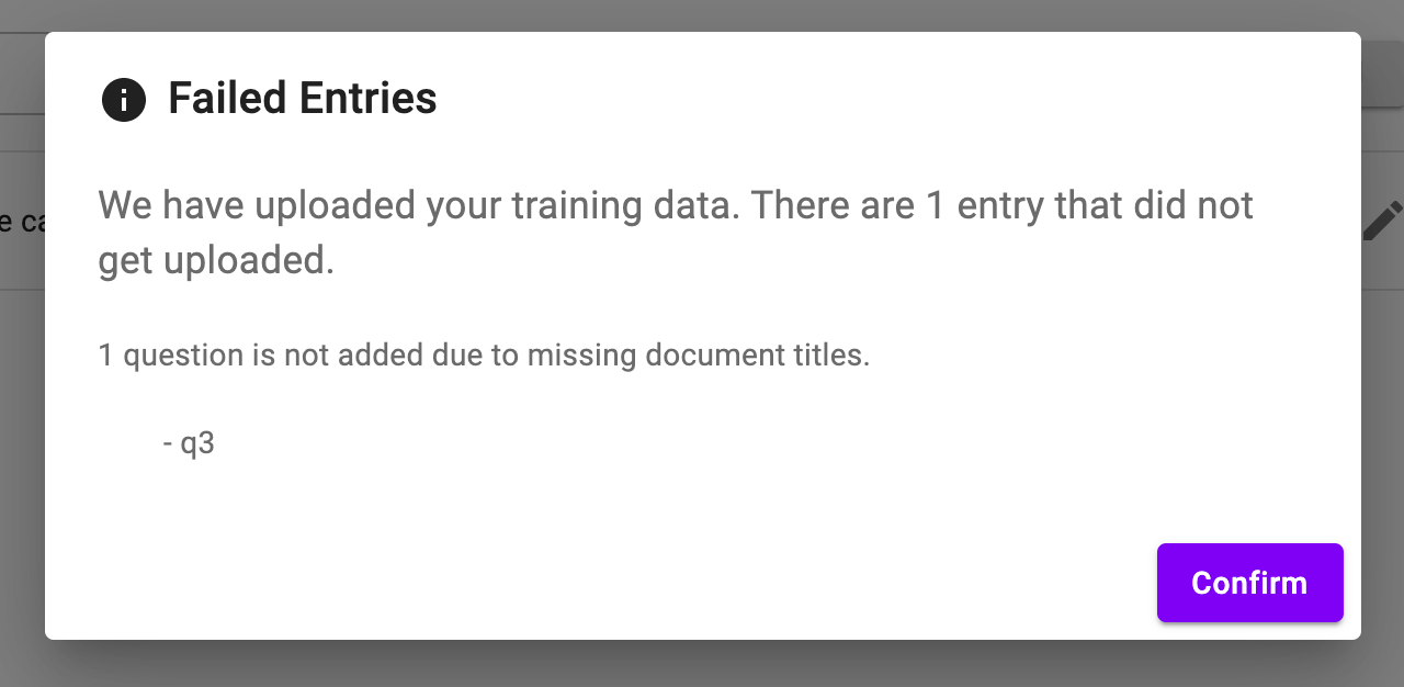 Here you can manually enter training data or modify/delete existing entries. You can also upload training data in bulk by clicking the upload icon. Keep in mind that question-document pairs are unique, so you cannot have two entries with the same questions and document titles.