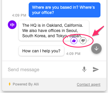 Now customers can give ratings to answers they get from the Q&A node. Agents can see the number of positive and negative ratings in the Alli dashboard and improve the quality of the Q&A database, considering the result.
