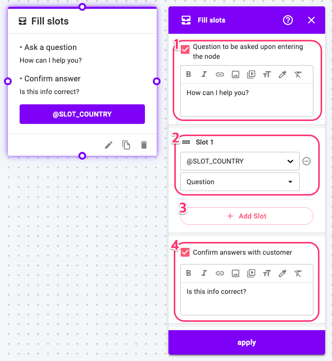 - Slots: The information you are extracting from customer's input. Select the variable to save the info and type in a question for the case when this slot is not filled by the customer's initial input. The conversation continues until all slots needed are filled and confirmed.