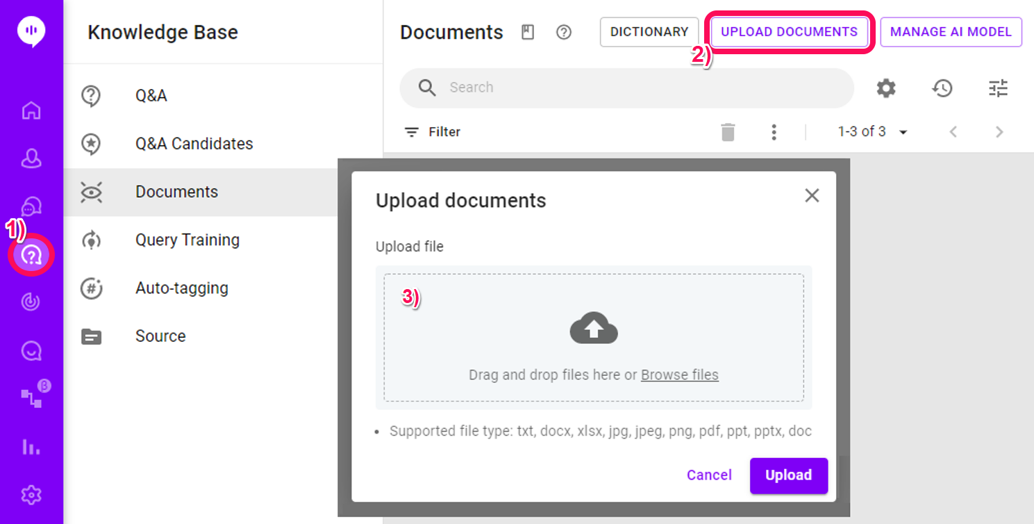 1) Documents can be uploaded in Knowledge Base