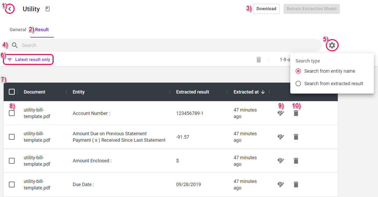 - Click to delete individual extraction result.