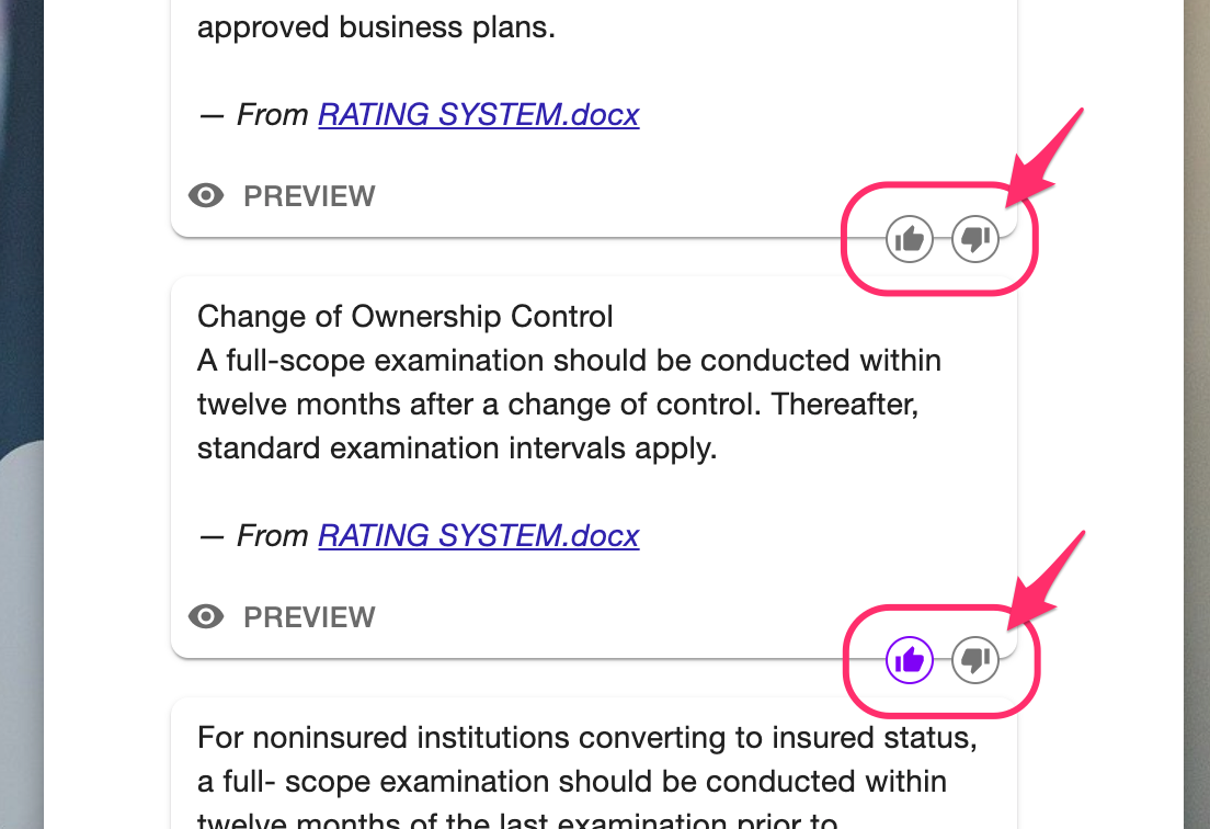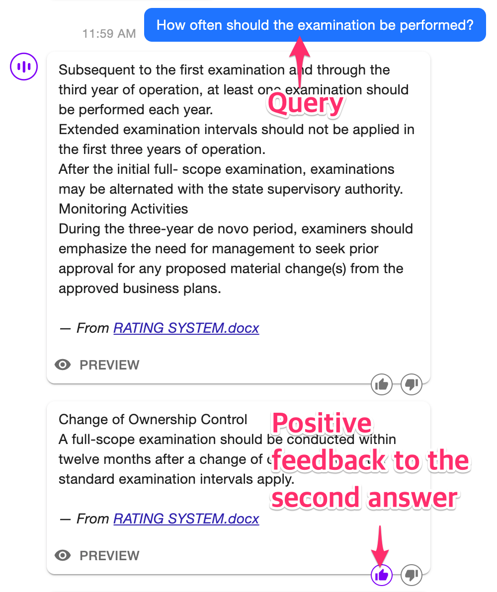 When a customer gives a feedback to a certain answer candidate for a certain query, it affects future search results for similar queries. For example, let's say a customer gave this feedback to 'How often should the examination be performed?' query: