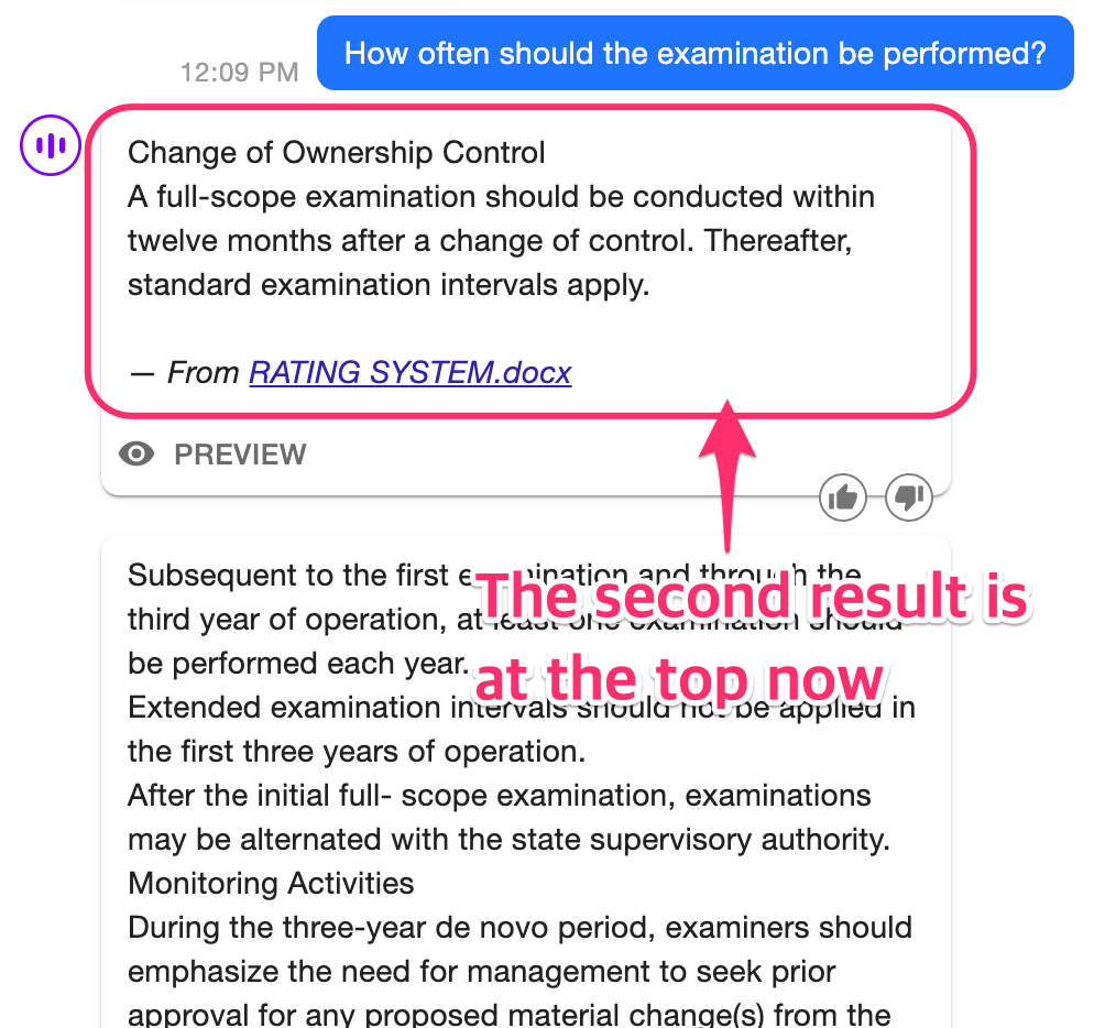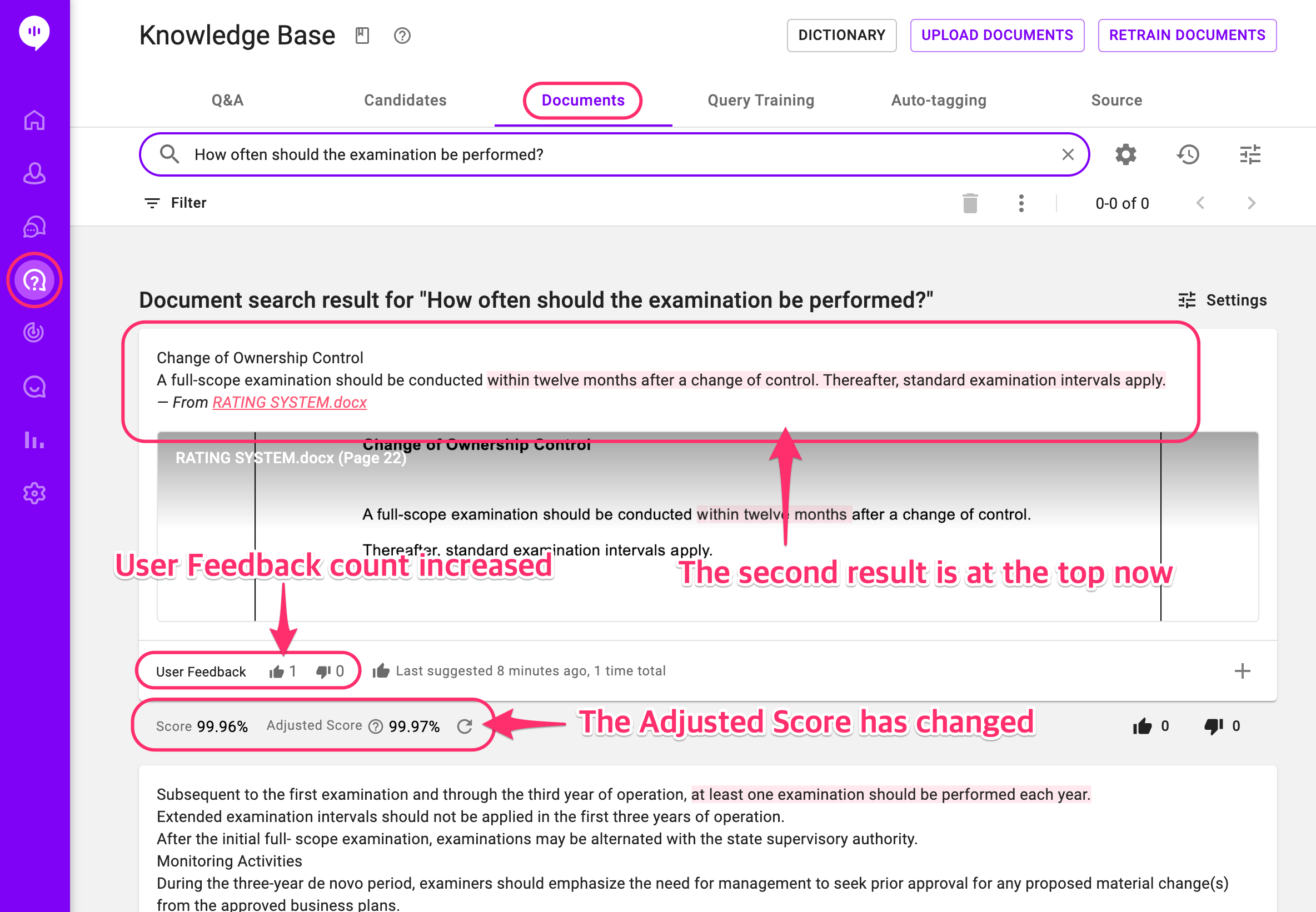 In the dashboard, under the Knowledge Base > Documents tab, you can see that the Adjusted Score on the answer for that query went up, and it's affecting the order of the search results, both on the dashboard and the conversation on the bot.