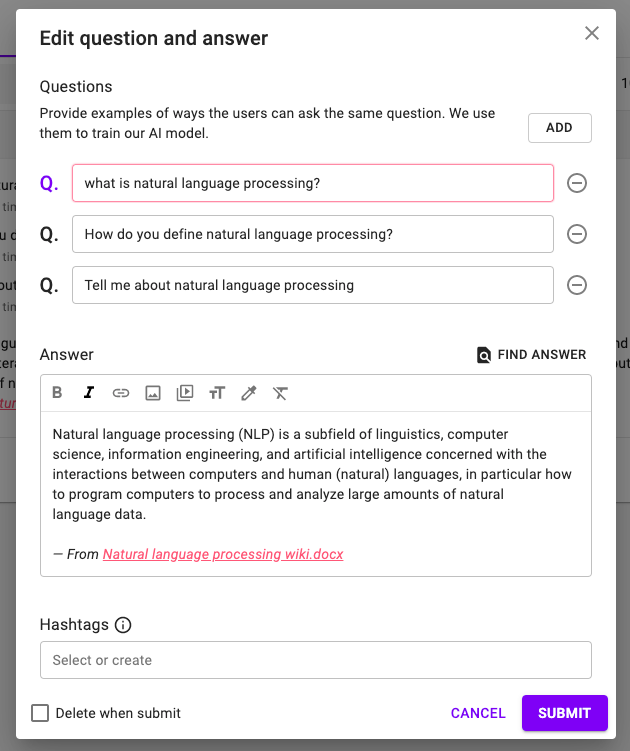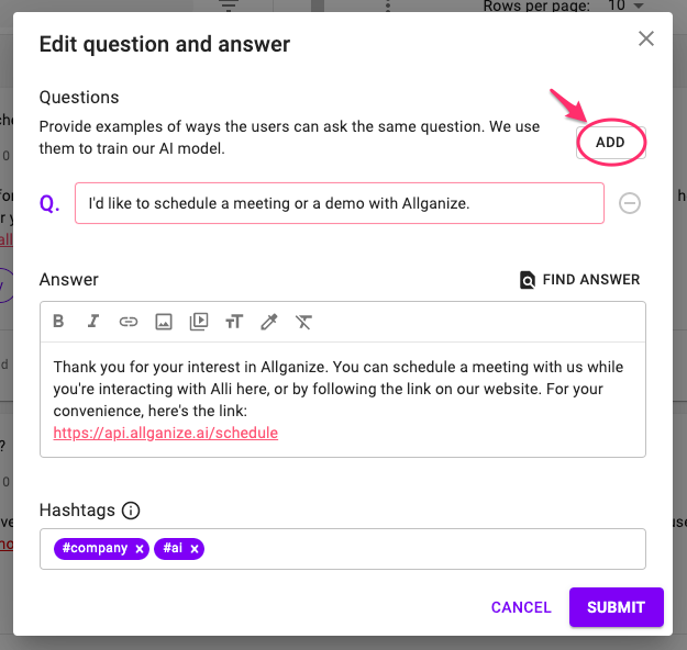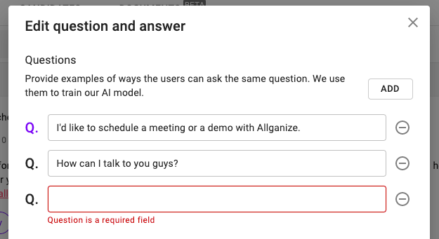 Alli's AI understands natural language and can search for the most relevant Q&A from your database even when the question doesn't have any matching keywords. In addition to this, you can add multiple questions to each Q&A to increase the accuracy of the AI even more.