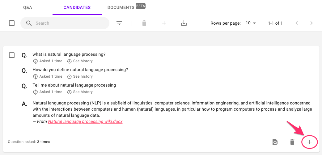 Under the CANDIDATES tab you can find similar unanswered questions that are grouped, possibly, with an answer automatically found from the documents you uploaded under the DOCUMENTS tab.