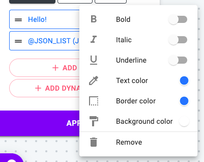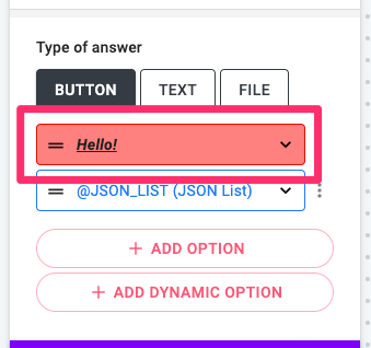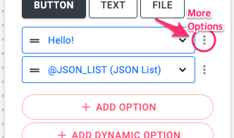 - Dynamic: Button options using dynamic variables such as String List, JSON, JSON List. Please check out the List Variables part from this user guide for more details.