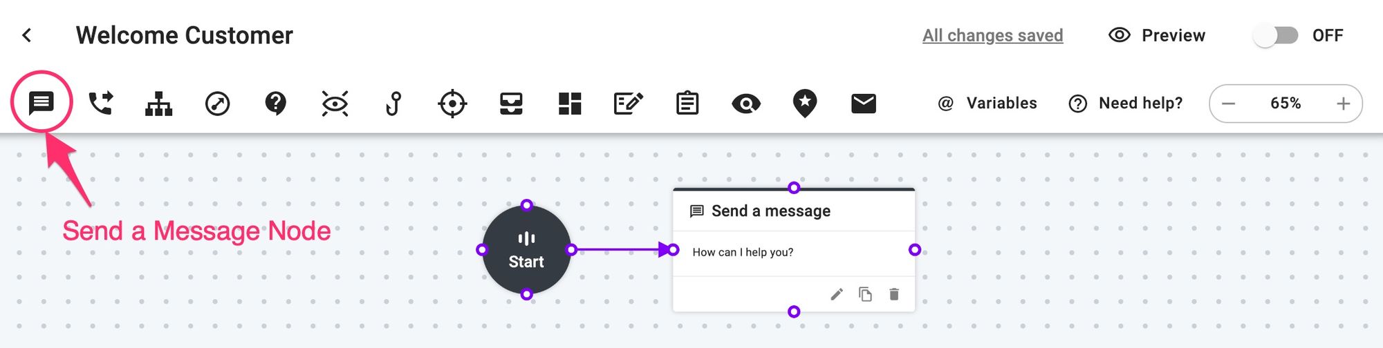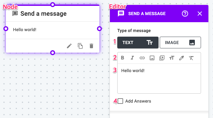 Send a Message node allows you to send text with rich media message or image to your users.