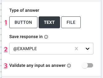 - Accept any input as answer: Activate to validate any input using the validation setting of the variable. To understand this feature better, check out these user guides.