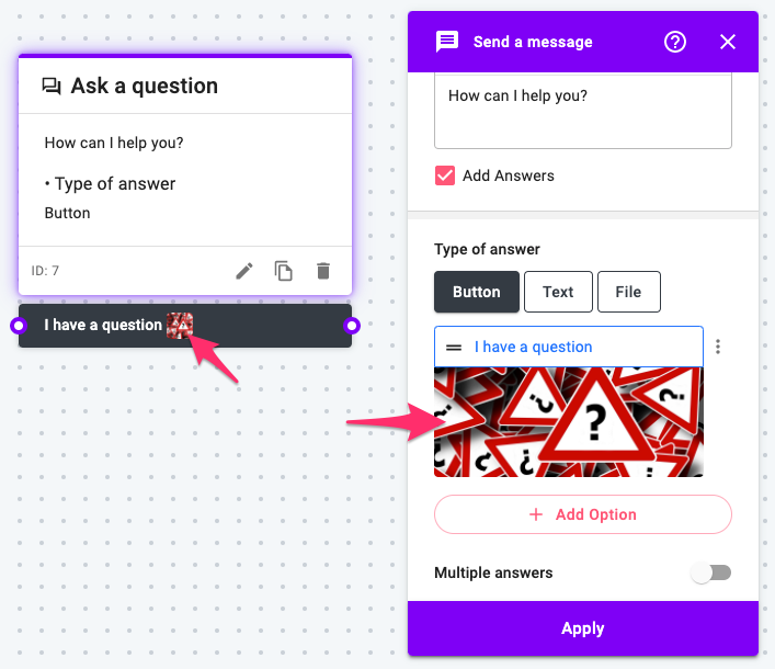 - Allow text input: If checked, users can type in text input instead of selecting a button option, and you can set a separate route upon text input. Multiple answers cannot be turned on if this option is on.