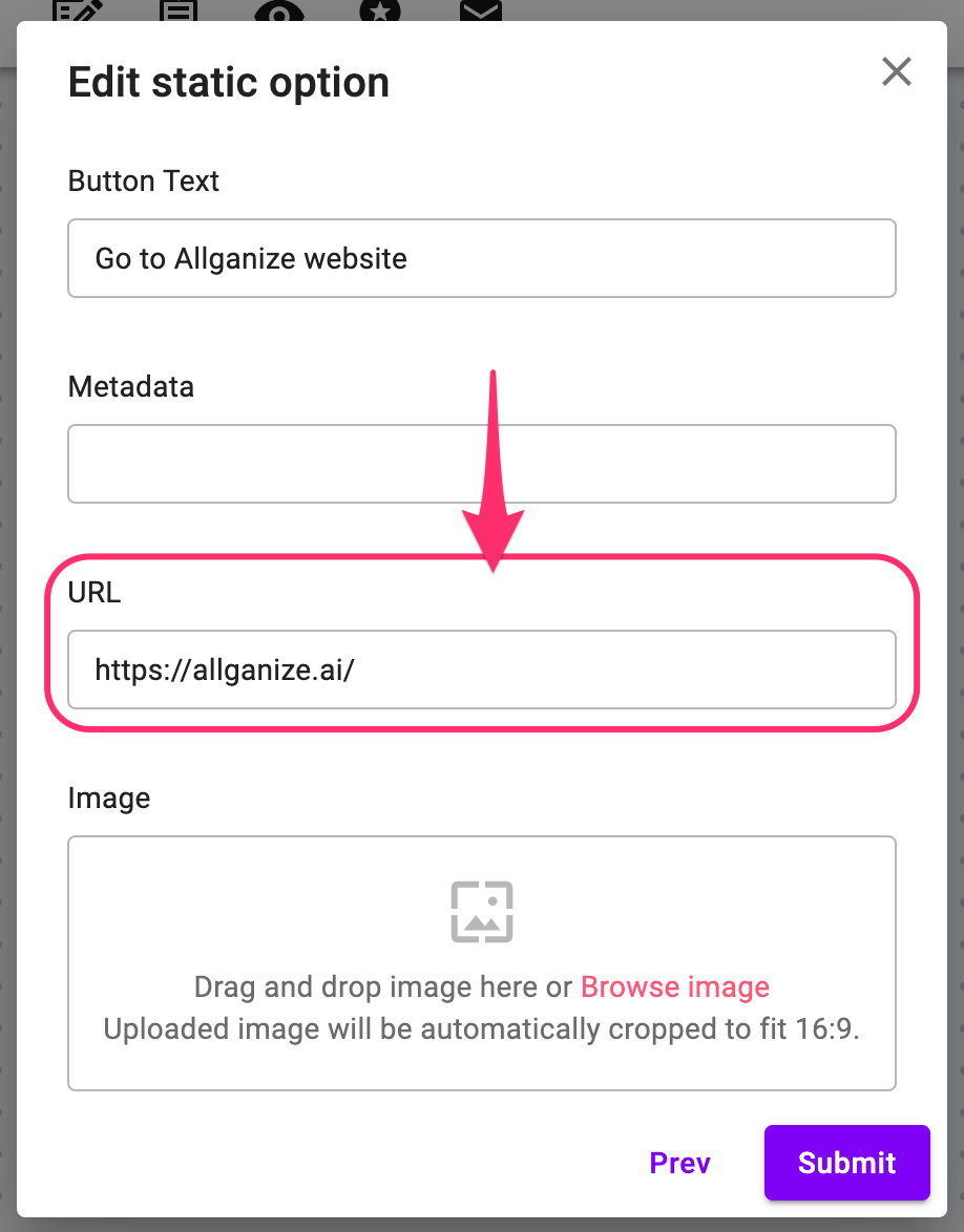 Another thing you can do with the button option is to open a HTML link when it's clicked. To do this, simply add the target URL in the URL field. Any button option types (Normal, Dynamic, and Q&A) support this feature.