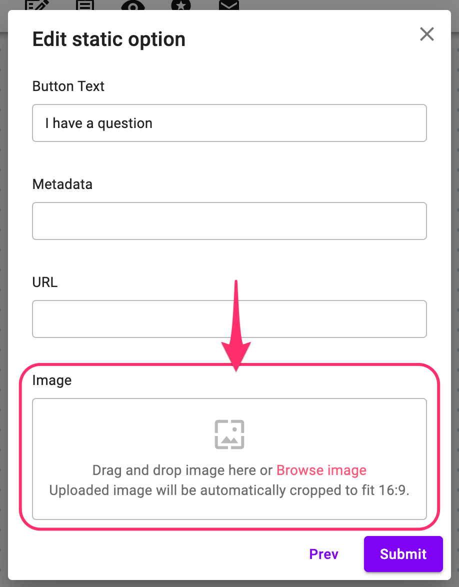 Also, you can add an image to any type of button option. After selecting the option type, simply browse or drag the image to the image field.