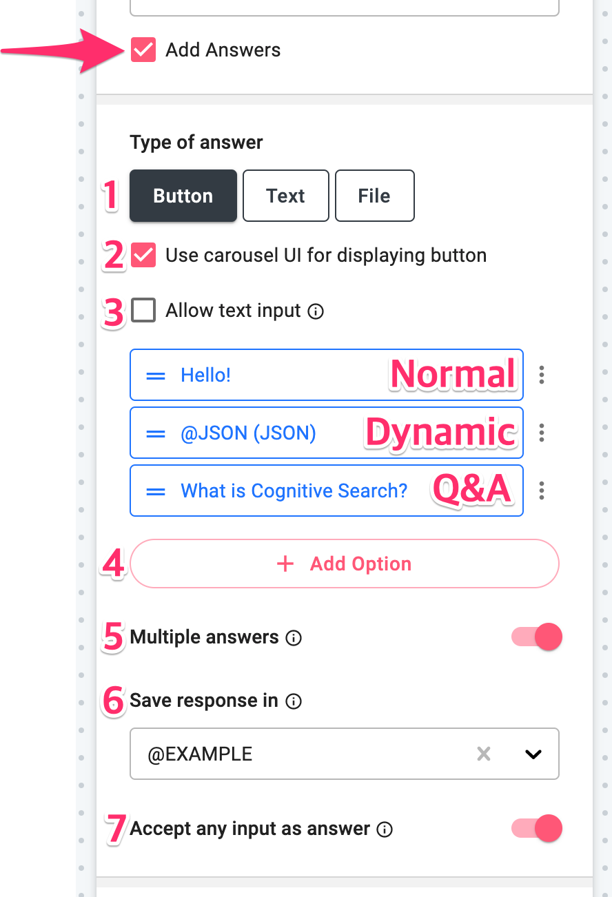 - Add Option: Add Button options for your users to select their answer. You can choose from Normal, Dynamic, Q&A after you click this.