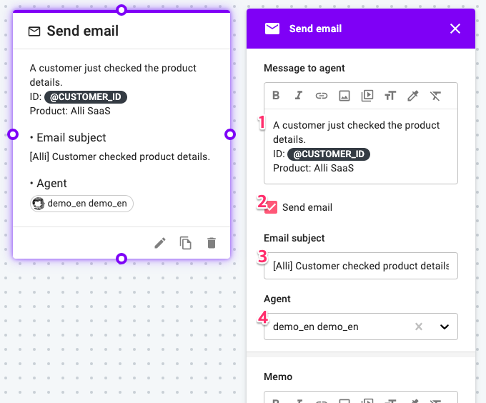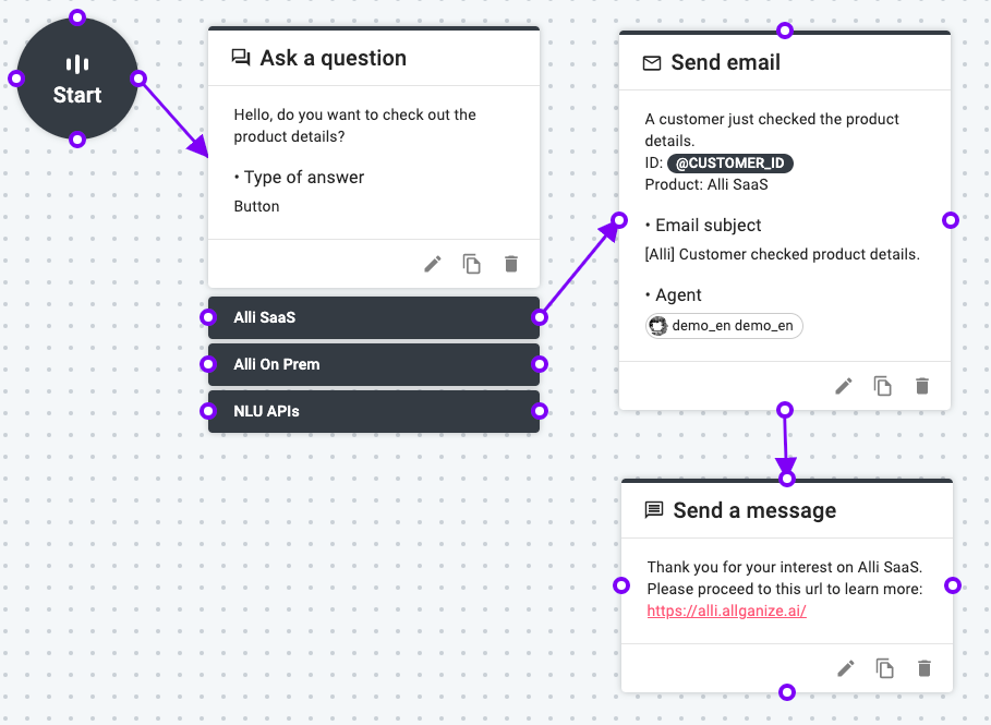 Please see the example use case of this node below. This chat flow sends an email (and the internal message) to 'demo_en' Agent if a customer selects 'Alli SaaS' for the question.
