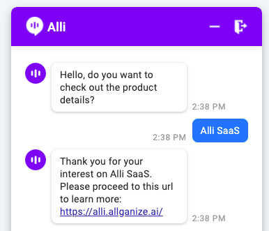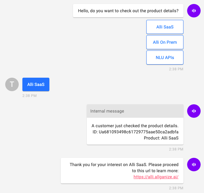 When a customer selects the 'Alli SaaS', this is what the customer will see. You can see that the internal message is not sent to the customer.