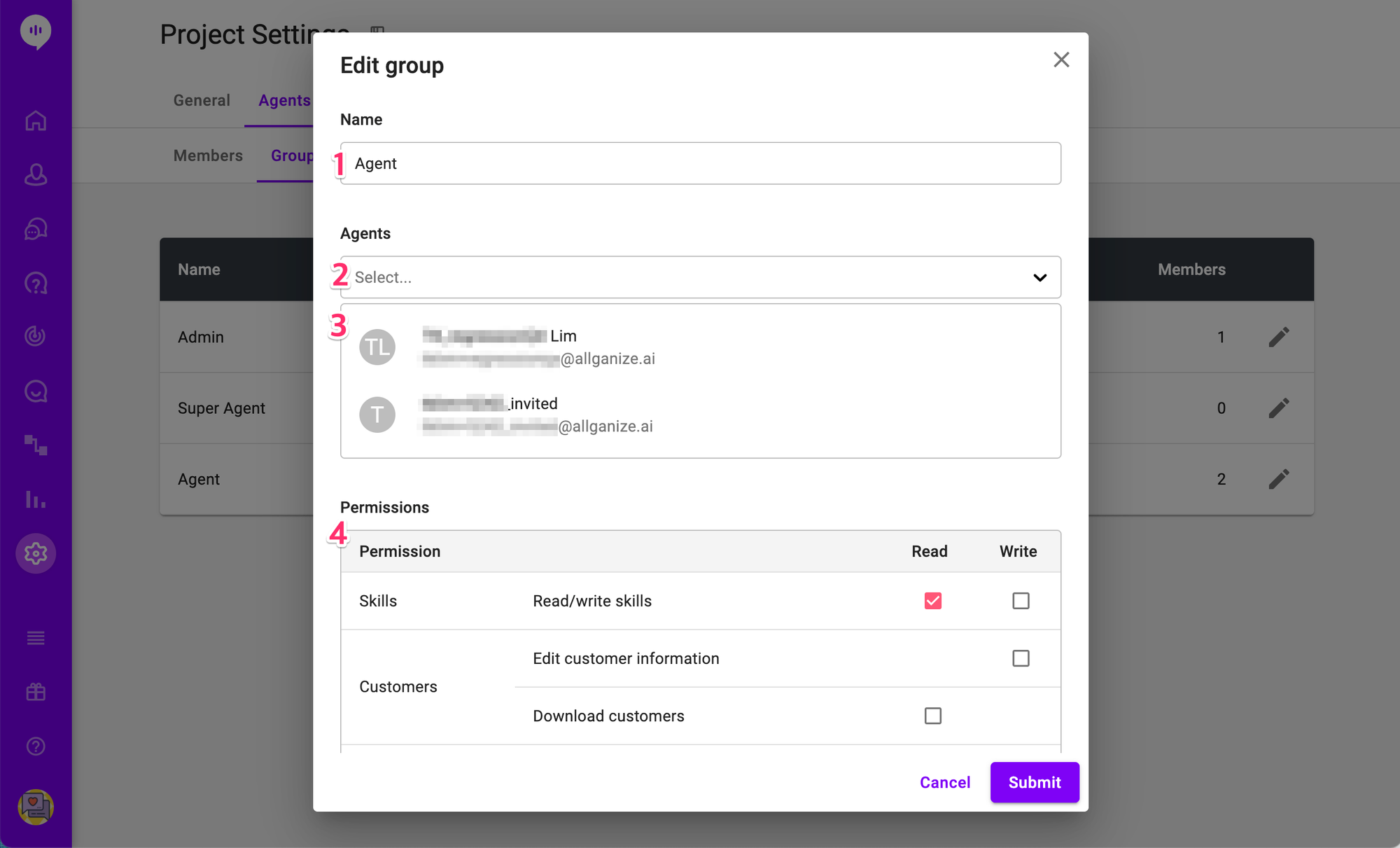 Under the Members tab, you can view, invite, and manage agents in the project. Under the Groups tab, you can manage the role groups. #manual #permission #admin