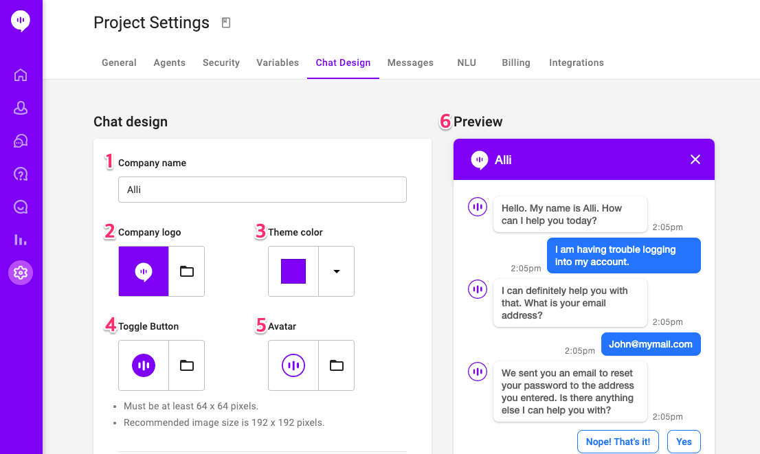 - Company Name: Customize the company name at the top bar of your chat UI.