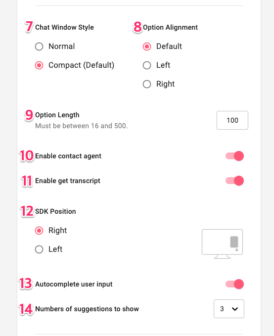14. Number of suggestions to show: Decide how many autocompleted Q&As show when #13 is on.