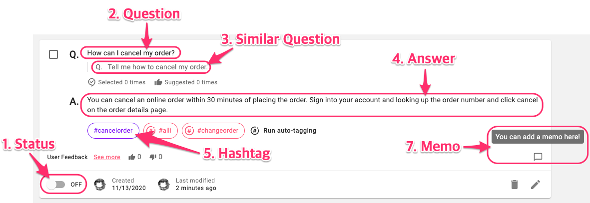 - [Optional] Memo: Add a memo to the Q&A item. To check the memo, mouseover on the memo icon at the bottom right of the Q&A.