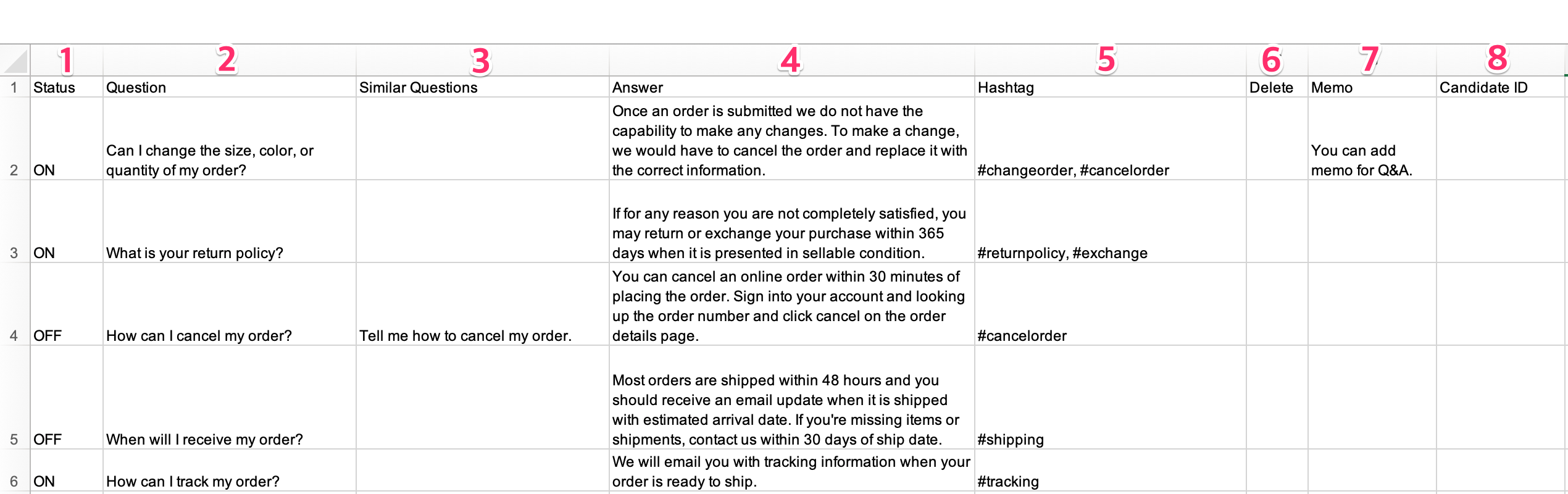 - [Optional] Status: If this is 'off' (not case sensitive), the Q&A is not included in the Q&A search. If the column doesn't exist or the value is 'on', the Q&A is included in the Q&A search.