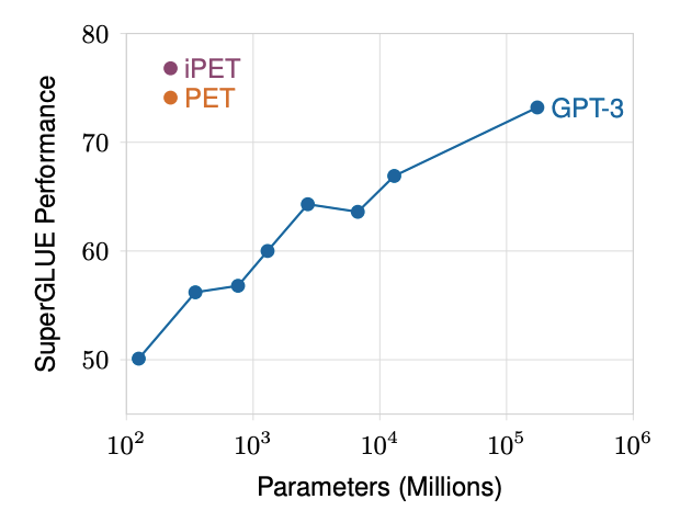 Performance similar to GPT-3 can be obtained with language models whose parameter count is several orders of magnitude smaller.