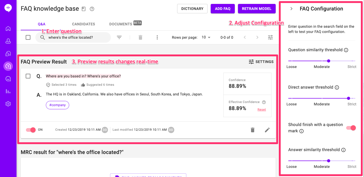 Repeating methods 1 and 2 increases the answer bot accuracy dramatically. In most cases, you can reach 80% to 90% accuracy to include the right answer in the answer candidate in just a few hours.