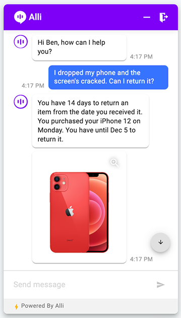 The example below shows a simple personalized Q&A conversation that provided an answer with a dash of personalization. Customers provide information about their needs, which refines conversations. This is a great example of personalized Q&A instead of generic Q&A response. You can set up a similar Q&A answer bot in Alli without any coding to answer with the Q&A defined by you in your knowledge base.