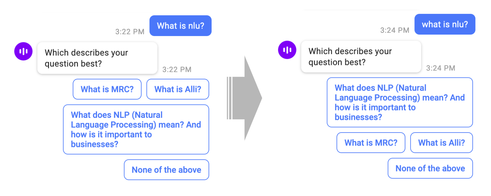 Since the Q&A with the highest User Score is displayed first, you'll see that the order of the options changes as the User Score changes. If the User Score is high enough and is above the Direct Answer Threshold, then the answer will be displayed directly to customers with similar search queries.