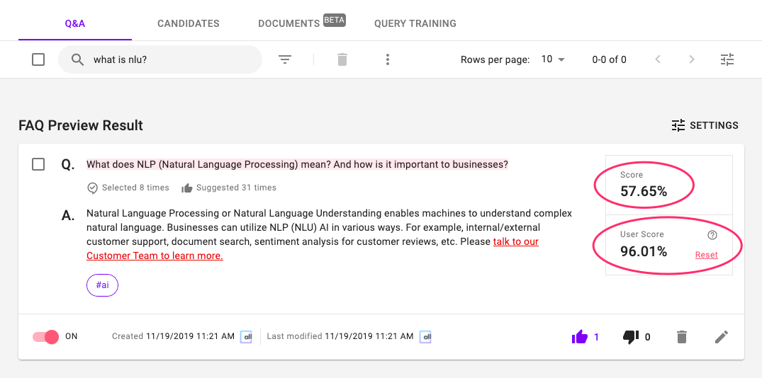 Now let's see how this changes the search result. When you enter a question in the search bar under Q&A, you'll see the preview result for the Q&A search with Score and User Score.