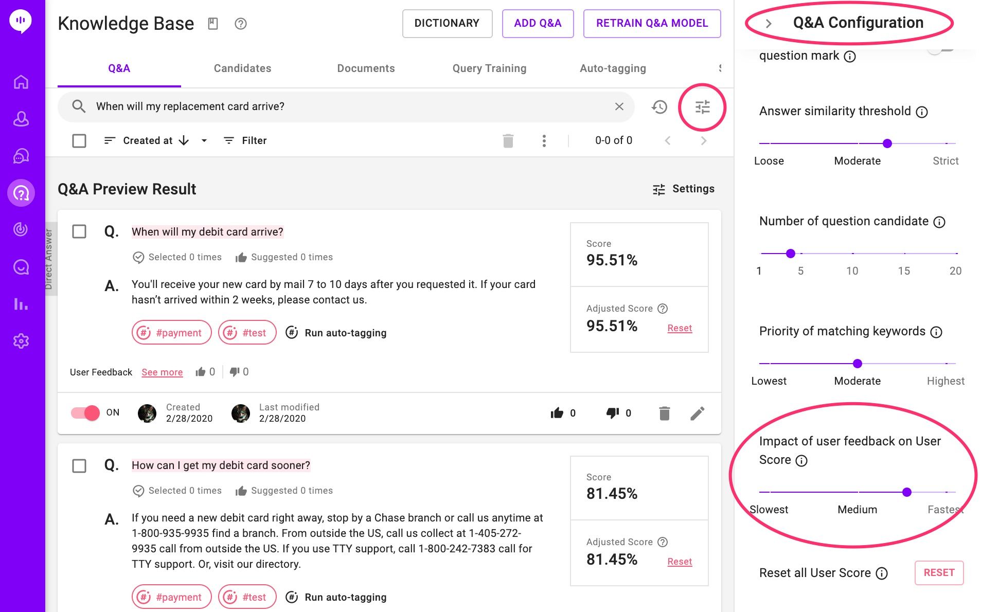 By changing the 'Impact of user feedback to User Score' value under Q&A configuration, you can let customers' Q&A selections affect future Q&A search results. Let's see how it works.