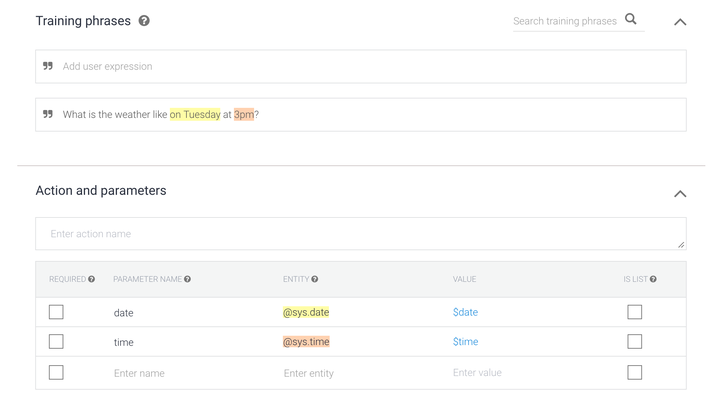 Getting up and running in Dialogflow is pretty straightforward. Dialogflow is very flexible with single-click integrations with many other channels. But I’d say it’s primarily for chatbots. It is the easiest to get started among the three. It relies heavily on intents for prediction by linking user’s request with the corresponding action. The intent matching may be restricted by listing contexts that must be present for intent to match. When we create an intent, Dialogflow gives us the “Training phrases” section where we will put the entries that will activate the Intent for the user.
